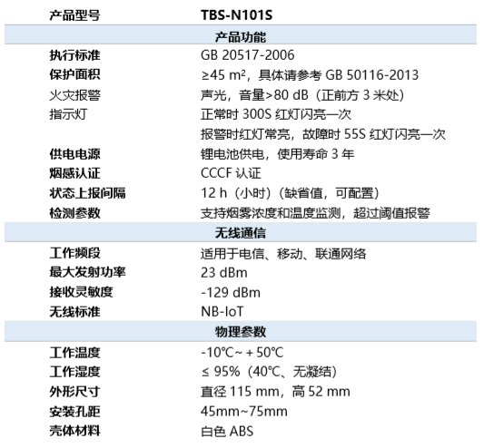 為進(jìn)一步滿足市場多樣化需求,優(yōu)化消防解決方案,拓寶科技NB-IoT新品煙感TBS-N101S正式投放市場。 TBS-N101S是獨(dú)立式無線感煙報警器,基于NB-IoT標(biāo)準(zhǔn),具備遠(yuǎn)距離無線通信能力,無需布線、即買即用;可同時檢測煙霧濃度和溫度,提升檢測準(zhǔn)確率;采用新方案設(shè)計,有效確保產(chǎn)品電池使用壽命更長;支持聲光、電話、短信、平臺等多種報警方式,有效預(yù)防火災(zāi)發(fā)生。