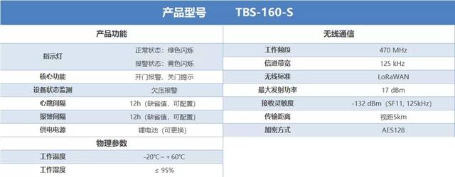 TBS-160S是一款具備IP65防水等級的無線門磁報警器,支持LoRaWAN標準,無線通信距離可達1~2 km,能夠實現遠程開門、關門提示等功能。