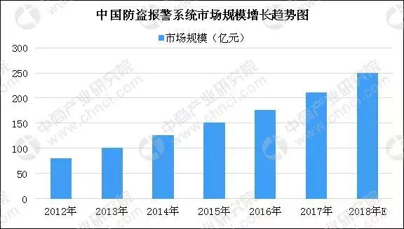 據中商產業研究院數據統計顯示:近年來,我國防盜報警器的銷售數量和總銷售額均以年均30%-60%的幅度高速攀升。具體來看,2016年我國防盜報警行業市場規模為180億元左右,2017年突破200億元,2018年突破250億元,這將是安防領域不可小覷的市場。